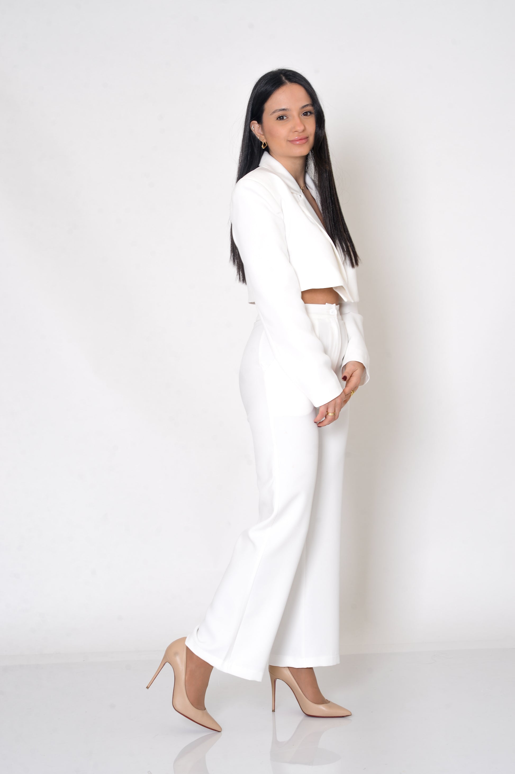 Designed for petite frames, this cropped white blazer features sharp tailoring, structured shoulders, and a flattering fit. Perfect for a polished yet modern look.